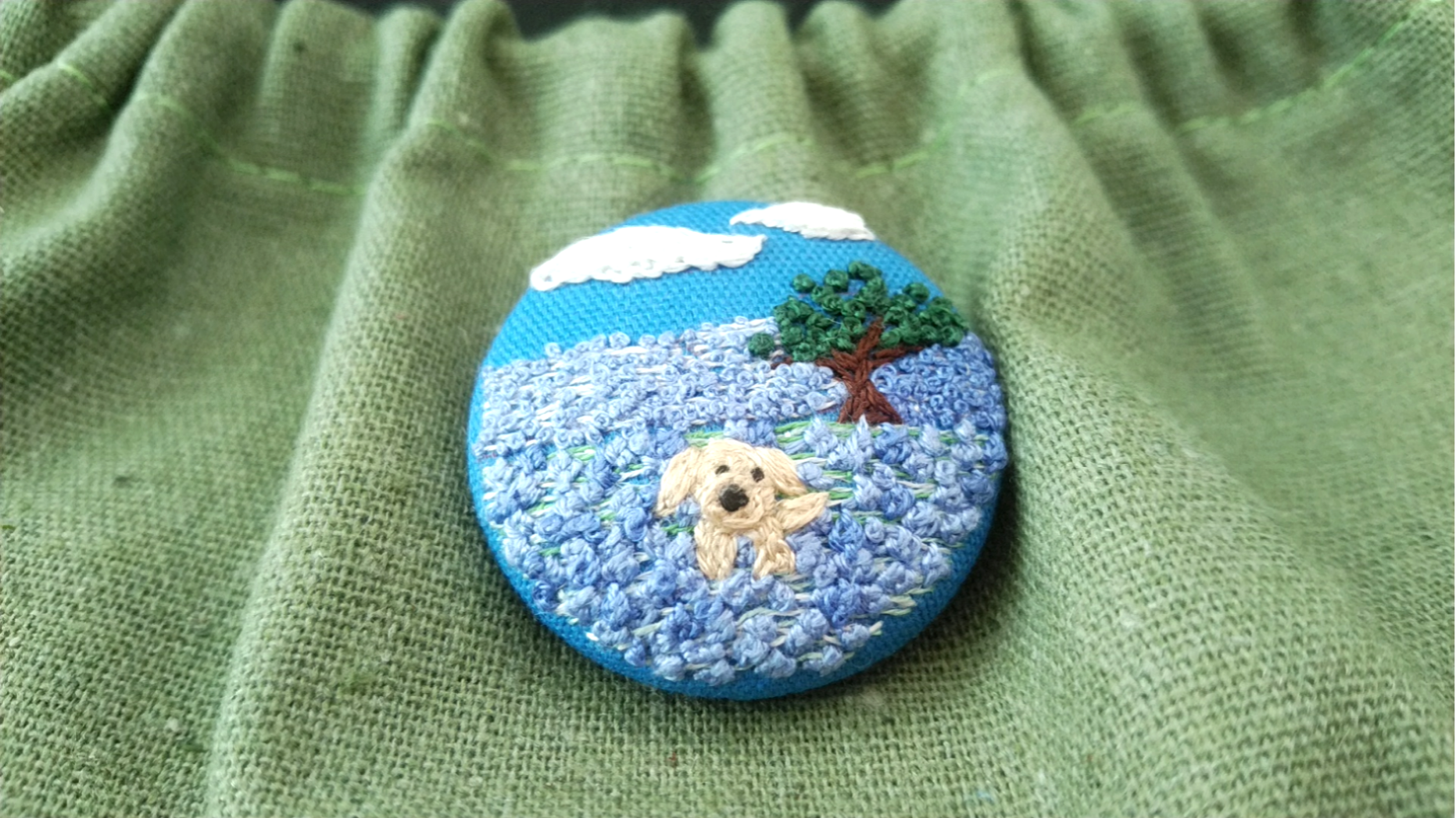 直径4㎝の中に癒しの世界を表現したくて好きなの風景と好きなわんこを手刺繍して、世界に一つのオリジナルブローチに仕立てました。