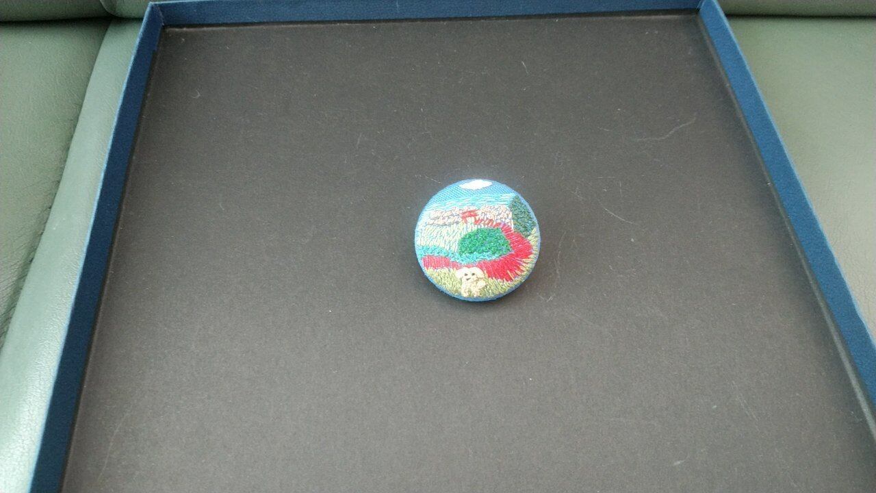 直径4㎝の中に癒しの世界を表現したくて好きなの風景と好きなわんこを手刺繍して、世界に一つのオリジナルブローチに仕立てました。