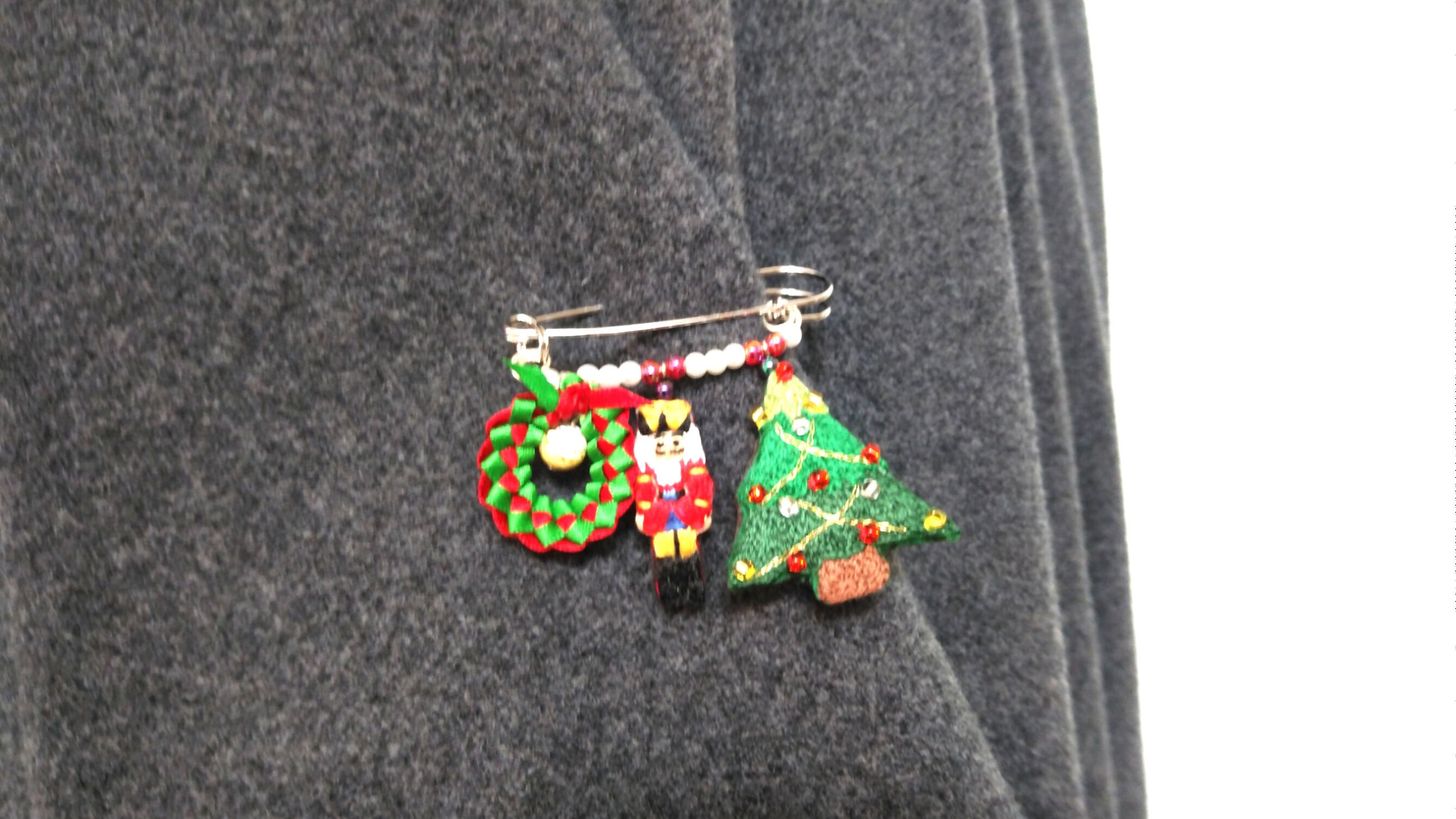 クリスマスツリーとくるみ割り人形を手刺繍し、ストールピンに仕立てました。